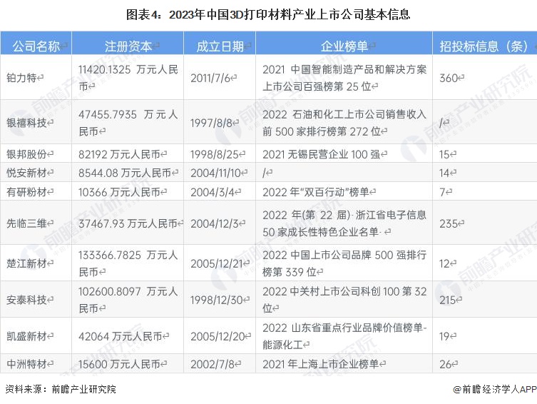 注:颜色越深代表数量越多2、3D打印材料产业上市公司基本信息对比从3D打印材料行业的上市企业布局和已有公开信息分析,注册资本最多的上市企业为楚江新材(002171.SZ);招投标信息最多的是铂力特(688333.SH),而成立时间最早的是银禧科技(300221.SZ)。