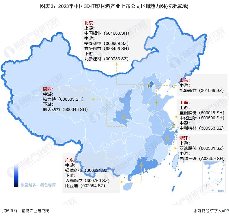 从3D打印材料产业上市公司的地区分布来看,北京市3D打印材料产业的上市企业数量最多,其中不乏安泰科技(000969.SZ)、有研粉材(688456.SH)等中游环节优势企业上海和广东两地的3D打印材料产业的上市企业数量亦较多,前者有。