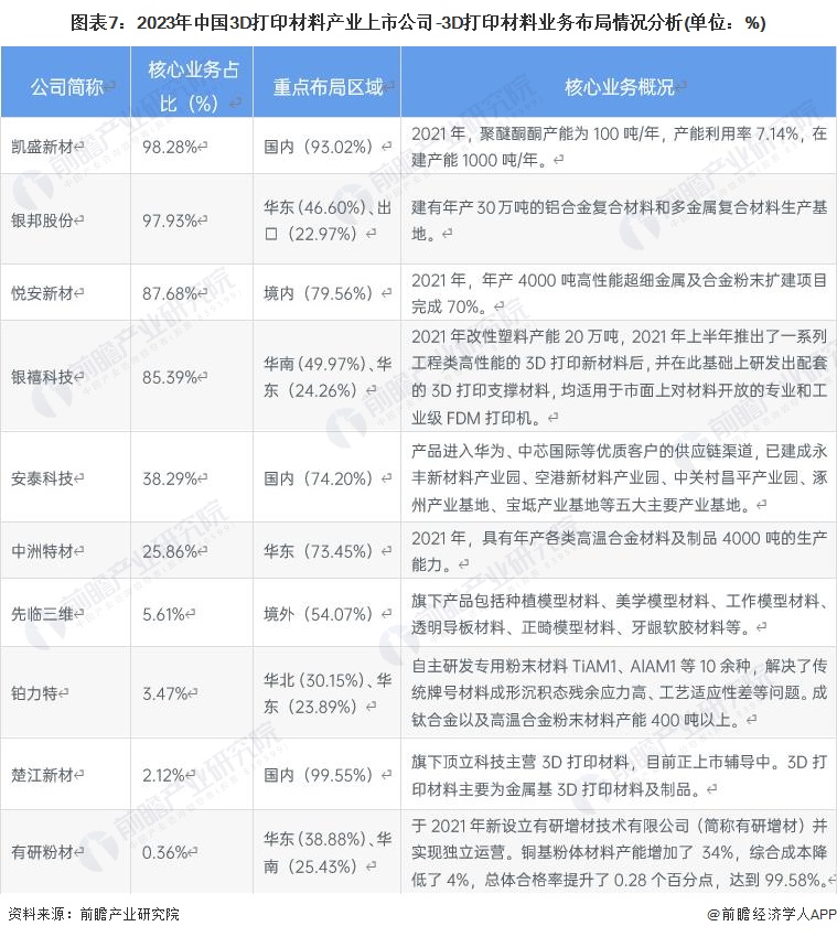 3、3D打印材料产业上市公司业务布局对比从业务布局来看,核心业务占比方面,凯盛新材(301069.SZ)、银邦股份(300337.SZ)均在90%以上,表明上述企业的业务较为集中;重点布局区域方面,各大上市企业多以境内业务为主,先临三维(A03459.SH)重点布局海外市场;核心业务概况方面,银邦股份(300337.SZ)建有年产30万吨的铝合金复合材料和多金属复合材料生产基地。