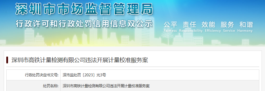 行政处罚决定书文号:深市监处罚〔2023〕光3号处罚名称:深圳市高铁计量检测有限公司违法开展计量校准服务案处罚类别1:罚款;其他-限制开展生产经营活动处罚类别2:处罚事由:计量违法行为处罚依据:《深圳经济特区计量条例》(2019修正)/第八章罚则/第四十四条/第2款未建立必要的计量标准器具或者未通过国家实验室认可开展计量校准服务的,责令停止开展校准服务,并按照前款规定给予罚款。