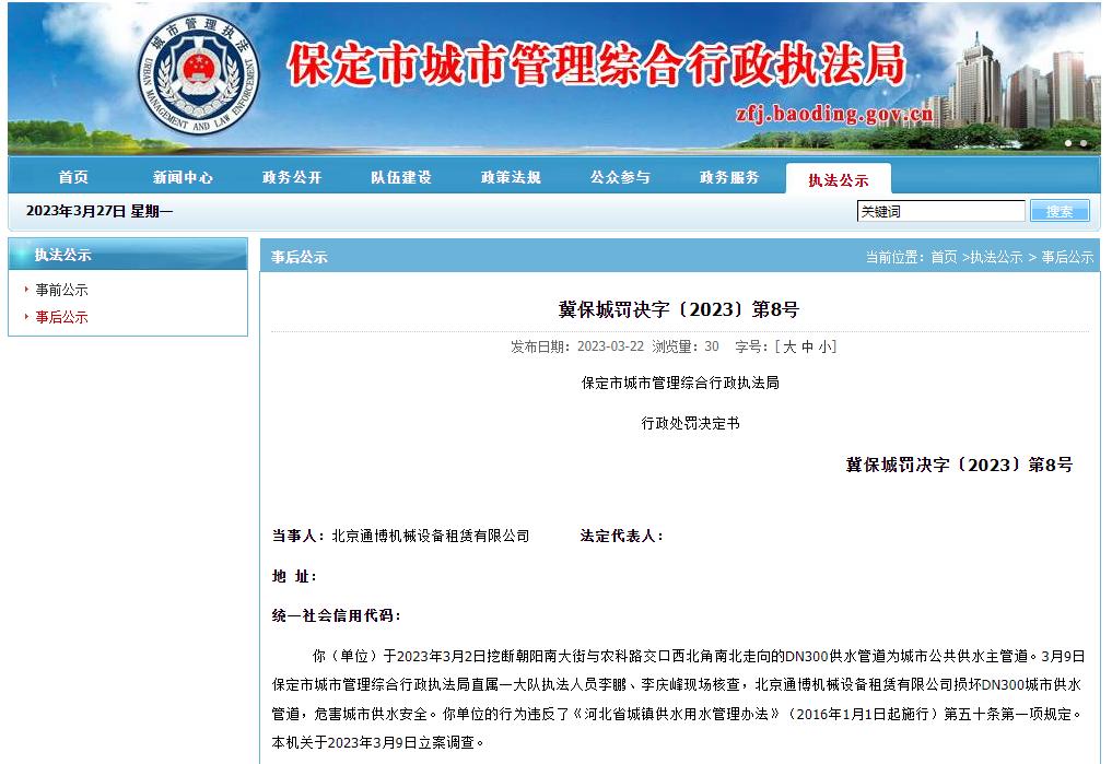 3月22日,保定市城市管理综合行政执法局网站发布行政处罚决定书(冀保城罚决字〔2023〕第8号)内容显示,北京通博机械设备租赁有限公司于2023年3月2日挖断朝阳南大街与农科路交口西北角南北走向的DN300供水管道为城市公共供水主管道。