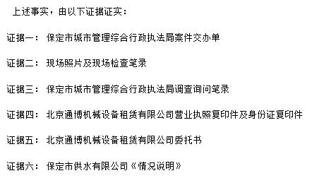 3月9日保定市城市管理综合行政执法局直属一大队执法人员李鹏、李庆峰现场核查,北京通博机械设备租赁有限公司损坏DN300城市供水管道,危害城市供水安全。当日,该局立案调查。