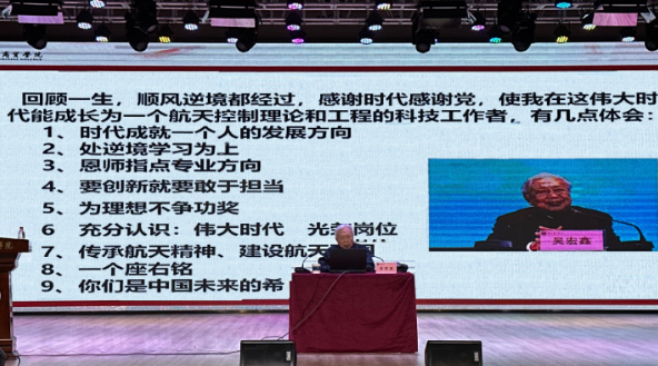 在讲座现场,吴宏鑫院士用朴实的话语,深情寄语同学们要树立“成功不必在我”的思想,在奋斗中坚持实事求是的态度和无私无畏的精神他希望当代青年学子传承航天精神,积极拥抱新时代、奋进新时代,让青春在为祖国、为人民、为民族、为人类的奉献中焕发出更加绚丽的光彩,做一名“立大志、明大德、成大才、担大任”的新时代有为青年。