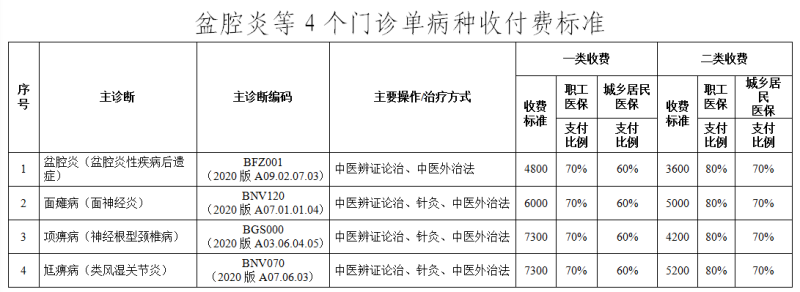 省医保局经研究决定将试点时间延长至2023年7月31日,执行范围、支付标准及相关管理要求均按原文件执行 该试点工作对盆腔炎(盆腔炎性疾病后遗症)、面瘫病(面神经炎)、项痹病(神经根型颈椎病)、尪痹病(类风湿关节炎)4个中医临床路径清晰、诊疗规范明确、诊疗技术成熟、医疗质量安全可保障、适合开展门诊诊疗的中医优势病种,在试点医疗机构参照住院管理和支付。