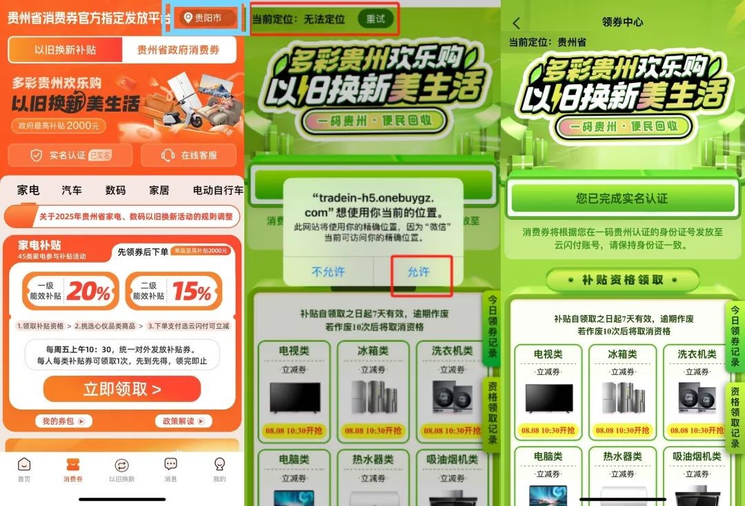 用户可在首页-我的-个人页面及以旧换新专区、资格券领取页面完成实名认证 根据平台数据显示,第三轮(8月16日)活动期间,“一码贵州”平台配置发放家电以旧换新消费券30800张、数码购新消费券30800张,合计61600张,参与活动人数约500万人,领券成功人数占比1.2%。