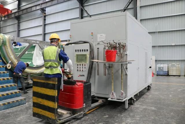 走进全市重大项目建设一线系列报道④ 在甘肃重通成飞新材料有限公司1号叶片成型车间,工人们正在操作一体管住胶机,整个灌注作业过程有条不紊隔壁2号叶片成型车间内,工人们正在铺层质检员在车间内不间断来回巡检,确保各生产流程规范有序。