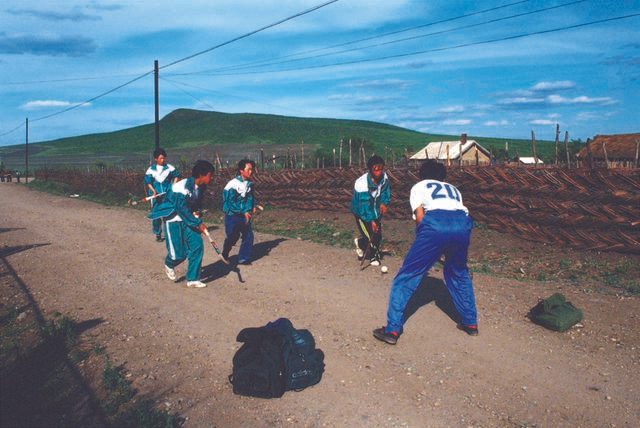 对达斡尔人来说,打球不拘于场地大小,也不计较人数多少,只要手里有杆,任何一片空地都是他们的曲棍球赛场小时候放学回家后,孟立志拿上家里长辈做的柞树球杆,和几个小伙伴一起在屯子里找块空地,书包往地上一摆当作球门,就开打了。