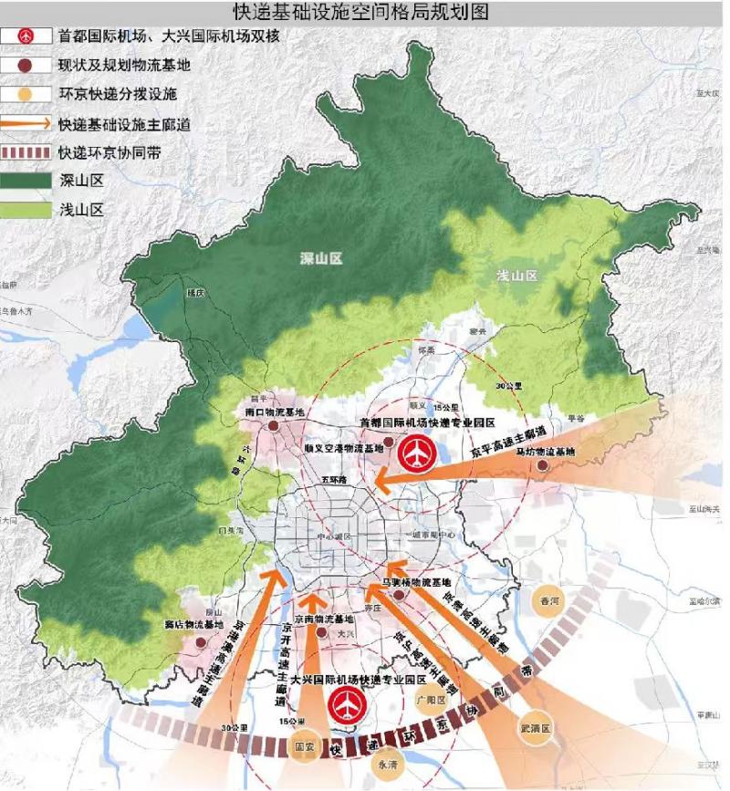《规划》提出,北京将构建“双核引领、六区联动、多点支撑、五廊贯通、一带协同”的空间格局具体布局上,北京将围绕首都国际机场、大兴国际机场分别形成南北两处快递专业园区,结合物流基地预留快递综合处理设施用地,全市共规划快递综合处理设施约20处;统筹考虑快递区域作业设施与快递综合处理设施、快递末端服务设施的有效衔接,全市共规划快递区域作业设施约100处;重点结合居住区、商业区、高校等人口密集地区布局快递末端服务设施,其中全市快递末端网点数量不宜低于3500个。
