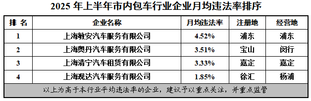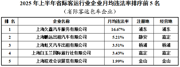 对该行业区分省际客运包车企业、省际客运班车企业及市内包车企业分别予以排名:省际客运包车企业:半年度月均违法率为1.06%,高于月均违法率的有11家企业,其中排名前3名企业为:上海久鑫汽车服务有限公司(16.67%);上海鹏远出租汽车有限公司(5.21%);上海虹义汽车出租有限公司(3.51%)
