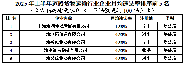 集装箱运输超限企业(车辆数超过100辆):半年度月均违法率为0.15%,高于月均违法率的有18家企业,其中违法率排名前3名企业为:上海海润物流发展有限公司(1.38%);上海滨拓储运有限公司(0.33%);上海徽冠物流有限公司(0.33%)