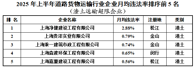 渣土运输超限企业:半年度月均违法率为0.37%,高于月均违法率的有7家企业,其中违法率排名前3名企业为:上海净健建设工程有限公司(2.88%);上海贵泽实业有限公司(0.79%);上海秉一建筑市政工程有限公司(0.74%)
