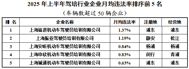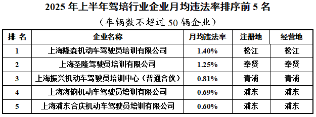 驾培企业(车辆数不超过50辆):半年度月均违法率为0.59%,高于月均违法率的有5家企业,其中违法率排名前3名企业为:上海隆森机动车驾驶员培训有限公司(1.40%);上海圣隆驾驶员培训有限公司(1.25%);上海振兴机动车驾驶员培训中心(普通合伙)(0.81%)