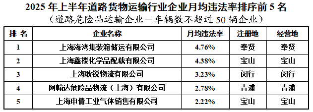 道路危险货物运输企业(车辆数不超过50辆):半年度月均违法率为1.37%,高于月均违法率的有14家企业,其中违法率排名前3名企业为:上海海湾集装箱储运有限公司(4.76%);上海鑫楼化学品配载有限公司(4.38%);上海耿锐物流有限公司(3.23%)