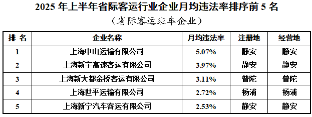 省际客运班车企业:半年度月均违法率为1.95%,高于月均违法率的有7家企业,其中排名前3名企业为:上海中山运输有限公司(5.07%);上海新宇高速客运有限公司(3.97%);上海新大都金桥客运有限公司(3.11%)。
