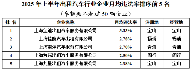 市交通委介绍,近日,市交通委执法总队对2025年上半年重点行业企业月均违法率排序情况进行了通报。相关违法率情况如下,详见↓01出租车行业