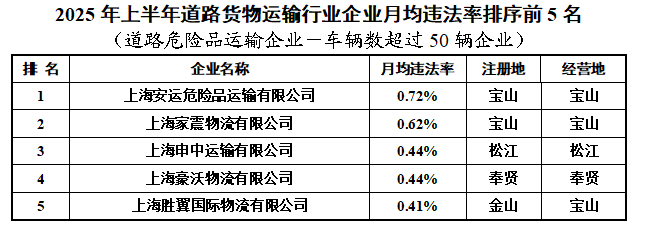 对行业内道路危险货物运输企业(区分车辆数超过50辆以及不超过50辆)、渣土运输超限企业、集装箱运输超限企业(车辆数超过100辆)予以分类排名:道路危险货物运输企业(车辆数超过50辆):半年度月均违法率为0.30%,高于月均违法率的有12家企业,其中违法率排名前3名企业为: