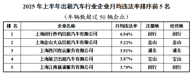 对该行业区分出租汽车车辆数超过50辆、不超过50辆分别予以排名:出租车企业(车辆数超过50辆):半年度月均违法率为1.32%,高于月均违法率的有17家企业,其中违法率排名前3名企业为:上海闵行妙玛出租汽车有限公司(6.94%);上海金山大众出租汽车有限公司(5.22%);上海西川客运服务有限公司(3.91%)