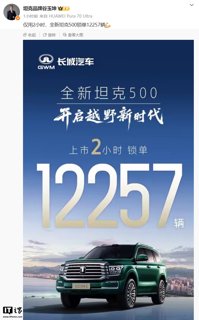 IT之家注意到,长城汽车股份有限公司 TANK 品牌执行副总经理谷玉坤发文称:“仅用 2 小时,全新坦克 500 锁单 12257 辆”。
