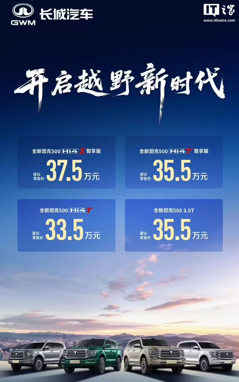 IT之家 8 月 28 日消息,长城汽车官方昨日晚宣布全新坦克 500 正式上市,官方指导价 33.5~37.5 万元Hi4-Z 智享版 37.5 万元Hi4-T 智享版 35.5 万元Hi4-T 基础版 33.5 万元(无高阶驾驶辅助系统)。