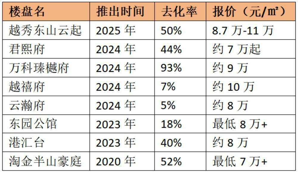 楼市黄金期,越秀区一手项目供应极少,使得该区产品非常抢手;而今楼市进入调整期,该区供应反而增加,致使在售项目去货压力陡增记者统计阳光家缘官网数据发现,从2023年至今推出市场的8个项目,去化率最低的还不足10%,去化率最高的则超过了90%(详见下表)。