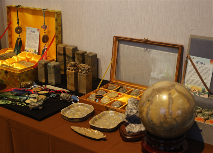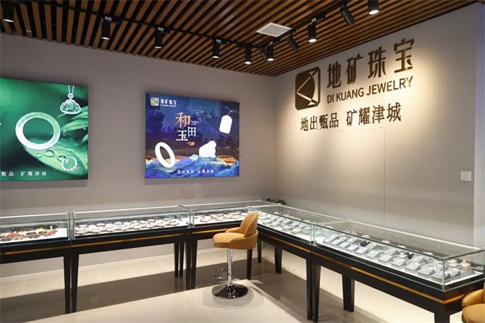 新落成的红桥分公司位于西于庄街道向东南路恒美雅苑底商,门店分为两层一楼100平方米的销售区陈列着品类丰富的珠宝首饰,包括翡翠、和田玉、珍珠等传统珠宝玉石,以及由公司子品牌“津门雅石”匠心打造的、采用蓟州区特产叠层石雕刻而成的精美文创工艺品。