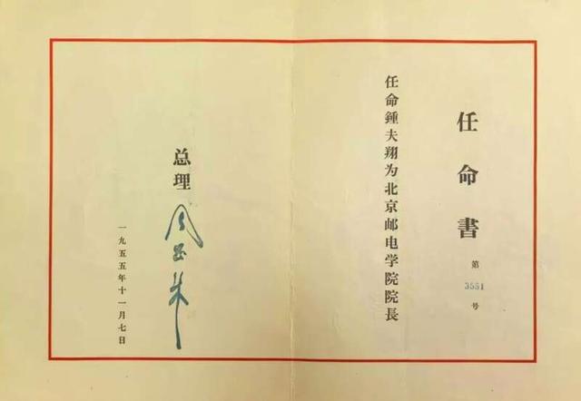 1955年,由周恩来总理亲自签发,任命钟夫翔同志为北京邮电学院院长的任命书北京邮电大学供图在展厅200余件档案史料及文物中,有件特别的史料——一份“任命书”这份任命书,1955年由周恩来总理亲自签发,任命钟夫翔同志为北京邮电学院院长。