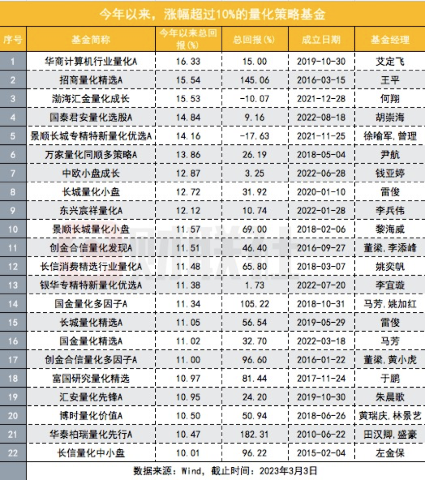 赚钱的基金来看,22只基金年内涨幅超过10%单个基金方面,数字经济催热之下,华商计算机行业量化表现最好,年内收益率达到16.33%全市场选股的量化产品中,王平管理的招商量化精选表现最好,为15.54%此外,该基金自2016年成立以来总回报也已翻倍,达到145.06%。