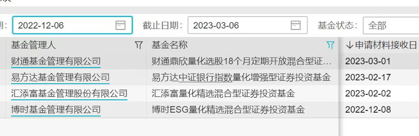 除了上述采取量化策略的基金,正在发行的量化主题今年还有三只,分布为申万菱信智能生活量化选股、万家元贞量化选股以及银行海外数字经济量化选股此外,包括财通、易方达、汇添富以及博时等四家基金公司近期上报了量化主题基金材料,等待监管审批。