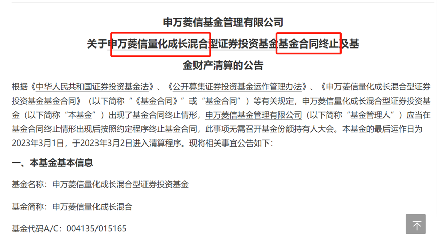 一只六年量化基金清盘一方面是如火如荼的新基发行,另一方面,一些沦为迷你基的量化产品也开始着手清盘。日前,申万菱信量化成长混合于2023年3月2日进入清算程序。