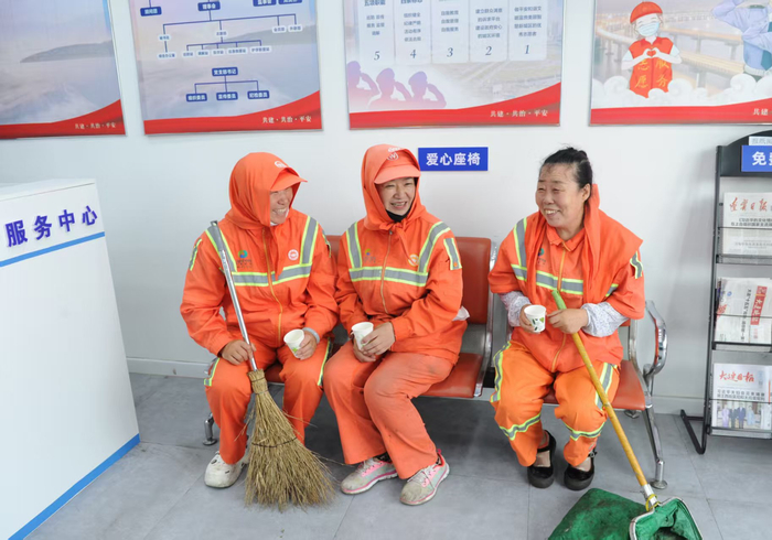 夏日炎炎,环卫工人和游客们在沙河口区平安志愿者协会设立的“爱心驿站”座椅上短暂休息该驿站位于人流密集的星海公园附近,面向社会大众推出“5+2”爱心服务模式,提供多项免费服务:一把椅子、一杯开水、一份报纸、一个电话、一次如厕,以及共享充电和失物招领等,及时为各类志愿者、环卫工人、快递骑手、的哥的姐、游客等有需求的社会大众提供急需的、实打实的免费服务,并设有调节纠纷的调解员,共同维护和谐秩序。
