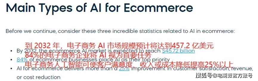 企业主们对AI抱有如此巨大的热情,并不令人感到意外近年来,技术快速发展,定向广告、聊天机器人、智能客服、智能搜索引擎等AI工具在电商领域得到了广泛应用,吸引了大量关注一份来自Bloomreach的数据显示,到2032年时,全球人工智能电商市场的规模预计会达到惊人的457.2亿美元。