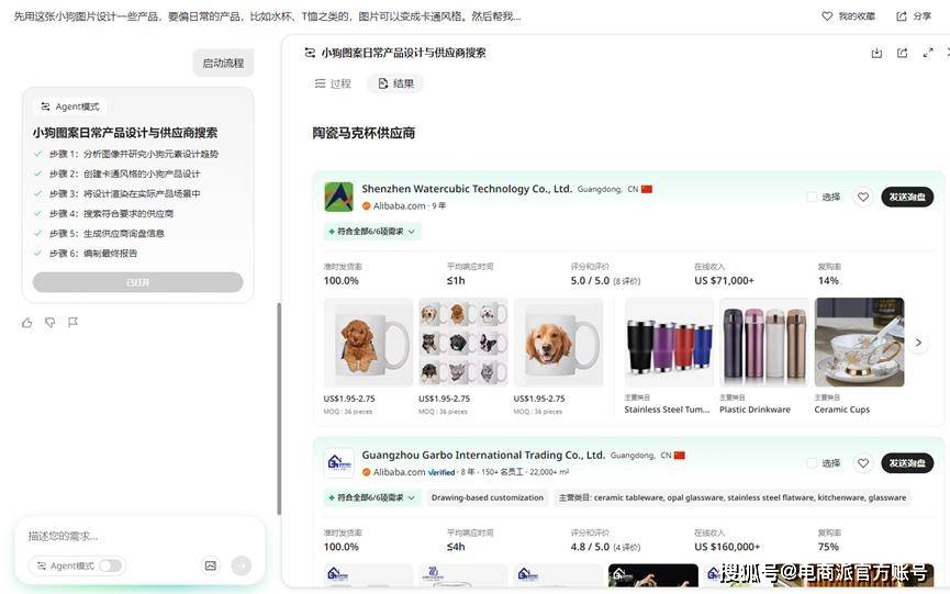 最终,它帮我们列出了一份完整的定制生产方案报告,既完成了产品设计,还帮我们列出了商家店铺链接,并在结果页显示出商家发货率、评分、复购率等重要信息,以方便我们筛选、评估此外,它还支持我们直接在结果页给厂商发送邮件询价。