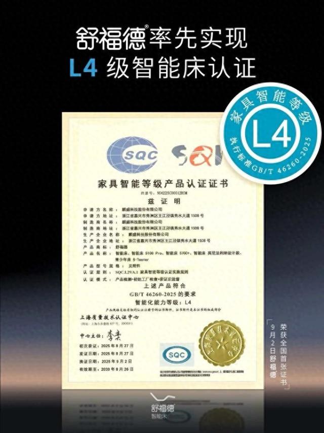 2025 年 9 月 2 日,中国智能家居行业迎来里程碑时刻 —— 舒福德智能床正式通过《智能家具等级评价及标识》(GB/T46260-2025)国家标准认证,成为国内首个荣获 L4 级最高等级认证的智能床产品。