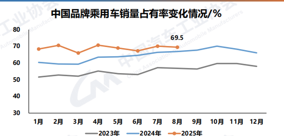 图片来源:中汽协中国品牌乘用车销量占比继续保持高位中汽协数据显示,8月,中国品牌乘用车共销售176.6万辆,同比增长21%,占乘用车销售总量的69.5%,较去年同期提升2.6个百分点在主要外国品牌中,与上月相比,法系品牌销量小幅下降,其他四大主要品牌销量均呈不同程度增长;与上一年同期相比,法系品牌销量呈两位数下降,其他四大主要品牌销量均呈不同程度增长。