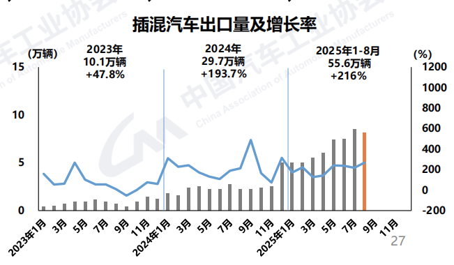 图片来源:中汽协细分来看,插混汽车在海外市场接受度快速提升,成为出口新亮点中汽协数据显示,1~8月,插混汽车出口55.6万辆,同比增长2.2倍;纯电动车型出口97.6万辆,同比增长52%其中,8月,插混汽车出口8.1万辆,同比增长2.7倍;纯电动汽车出口14.3万辆,同比增长63.4%。