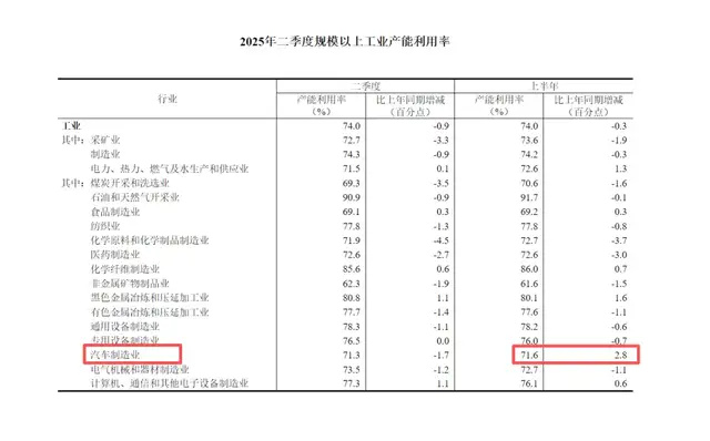 藏在信息过剩背后的,依然是汽车行业产能过剩的问题。根据国家统计局的数据,2025上半年汽车制造业产能利用率为71.6%,比去年同期提升了2.8%。(见下图)