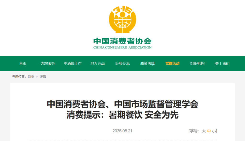 为保障广大消费者暑期餐饮安全8月21日中国消费者协会中国市场监督管理学会提示消费者要增强意识科学防范