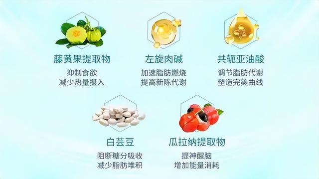 藤黄果中的羟基柠檬酸有效阻断脂肪合成路径,减少脂肪堆积;左旋肉碱作为关键载体,大幅提升脂肪酸向能量的转化效率;瓜拉纳提取物适度刺激基础代谢率,防止减重期常见的代谢减缓;共轭亚油酸则促进肌肉增长和脂肪减少,帮助塑形紧致;白芸豆提取物选择性抑制碳水化合物消化,降低脂肪生成风险。