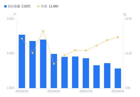 8月22日消息,数据显示,截至2025年8月20日,中创物流A股股东总户数为2.05万户,较上期(2025年8月8日)减少1240户,降幅5.70%公司最新A股总股本为3.47亿股,其中流通A股3.47亿股,户均持有流通A股数量为1.69万股,较上期增加961.8股,增幅6.04%;户均持流通A股市值20.03万元,较上期增加1.33万元,增幅7.12%。