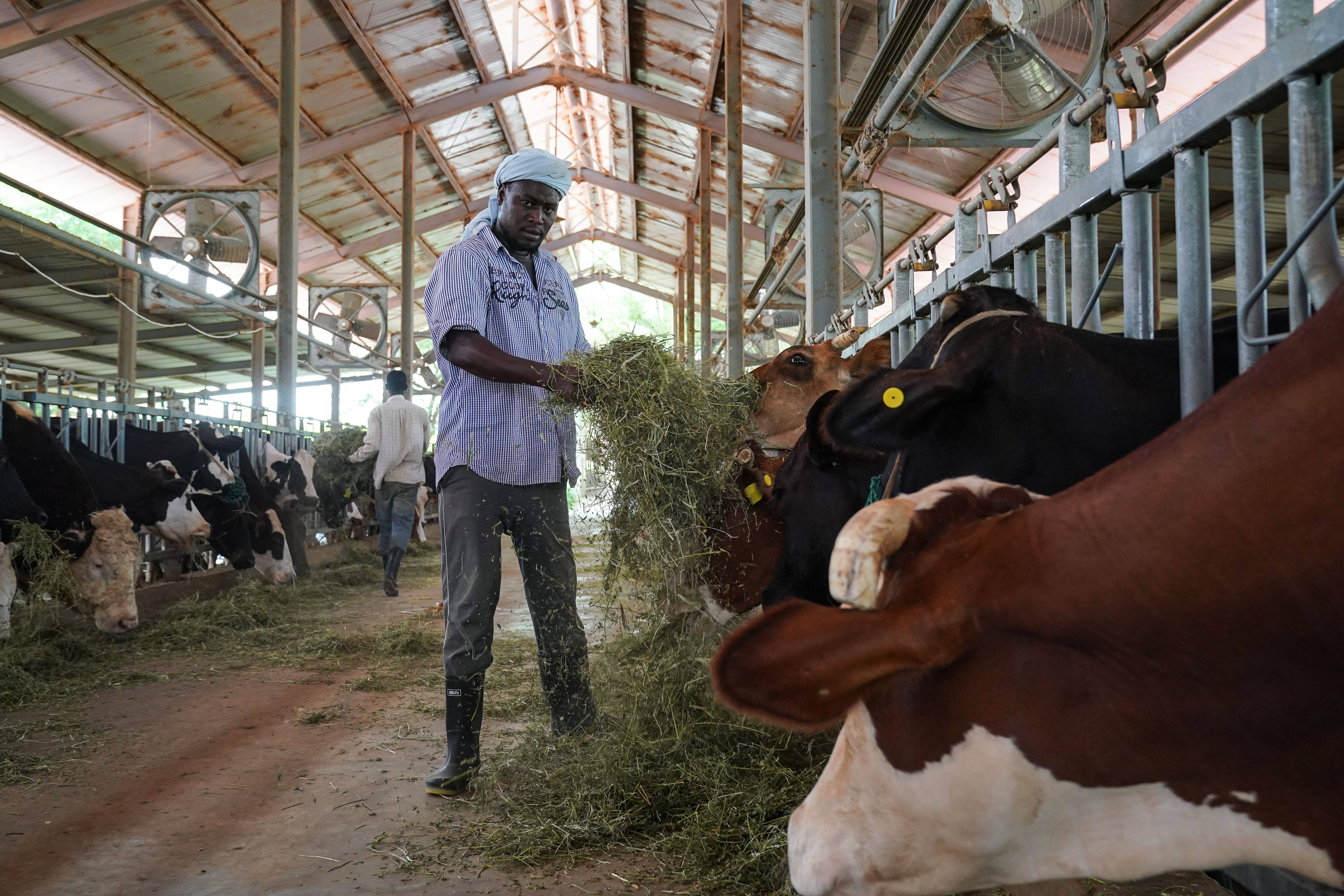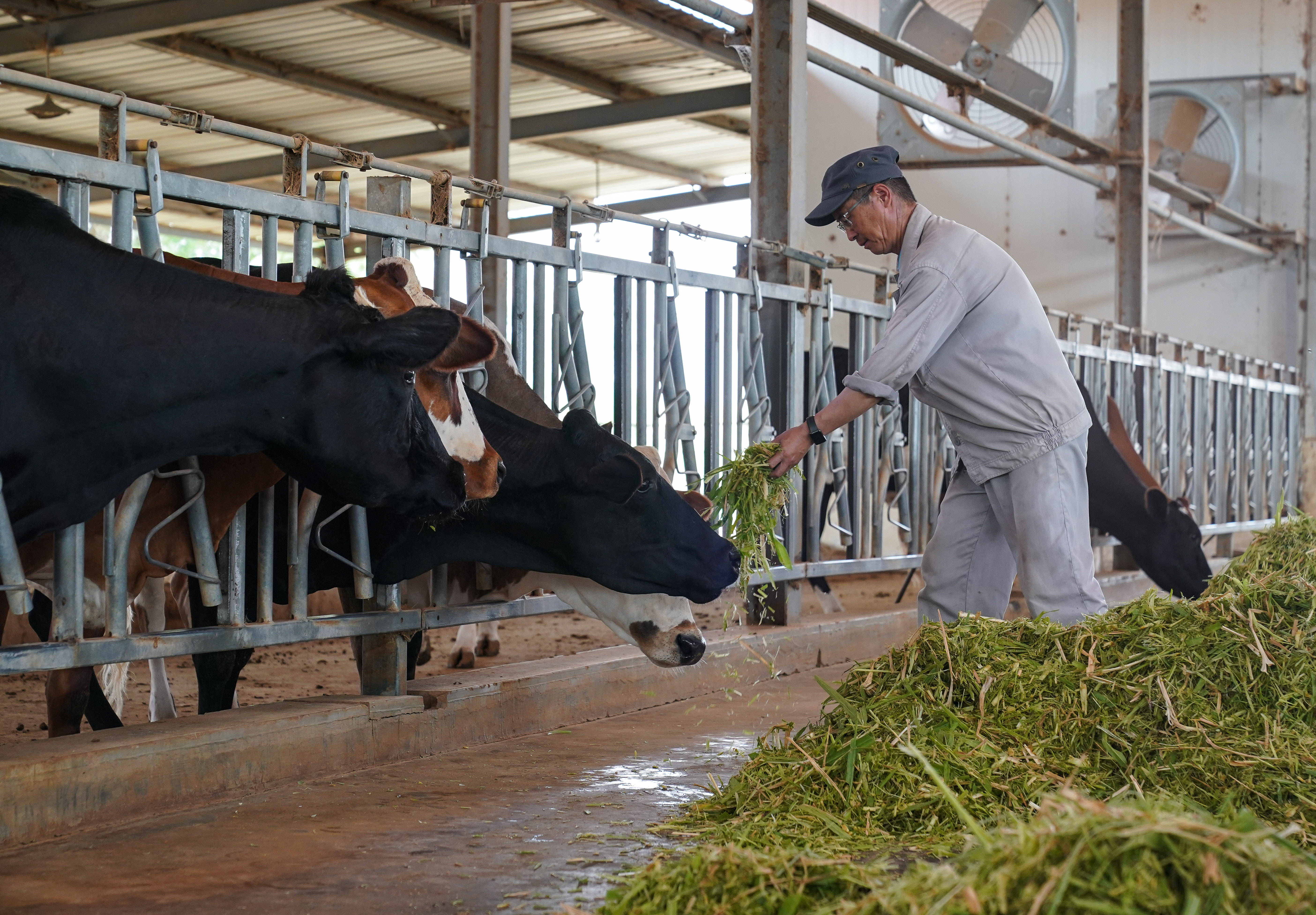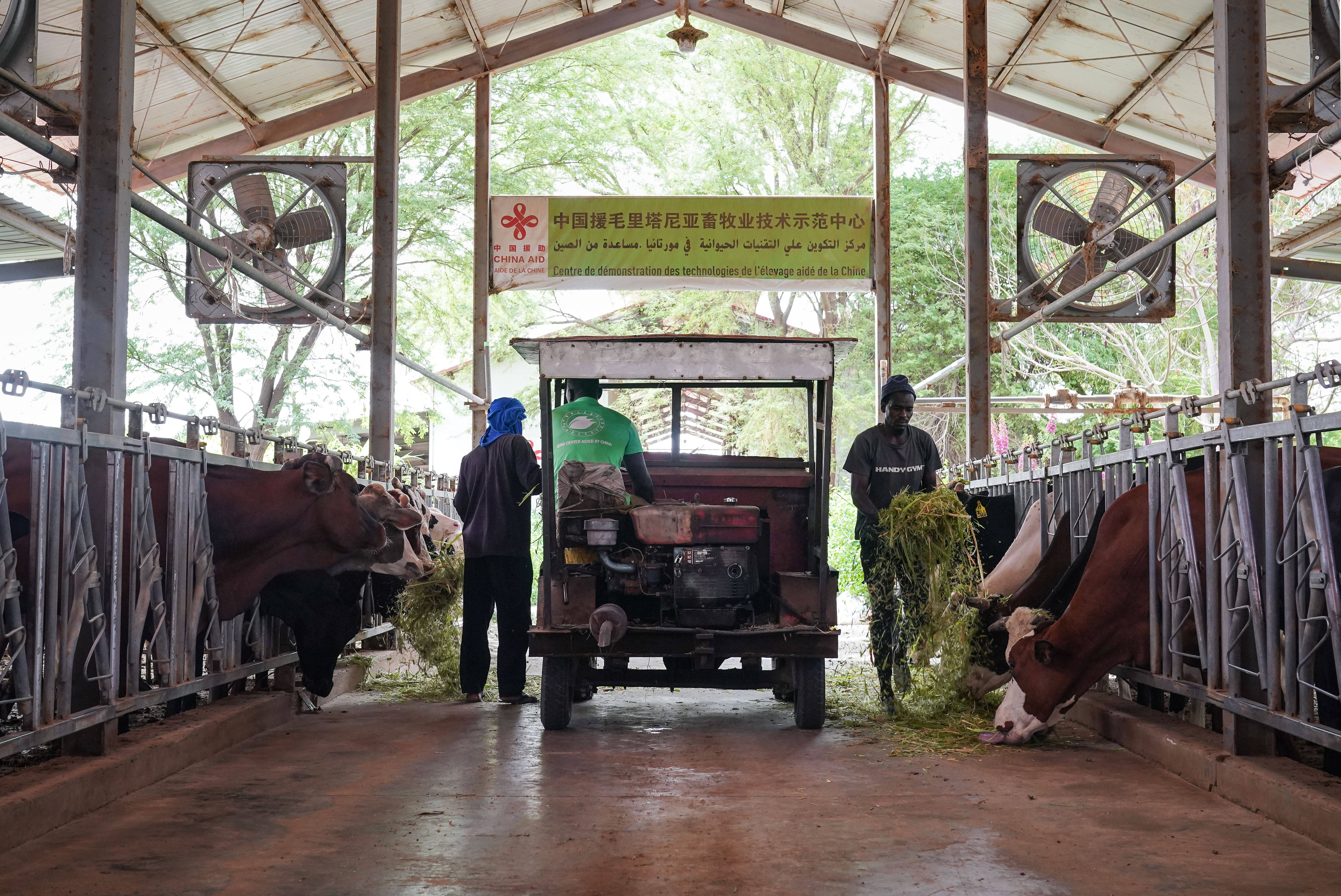 7月18日,在毛里塔尼亚伊迪尼村,牧民在中国援毛里塔尼亚畜牧业技术示范中心给牛群喂食菌草饲料。 新华社记者 韩旭 摄