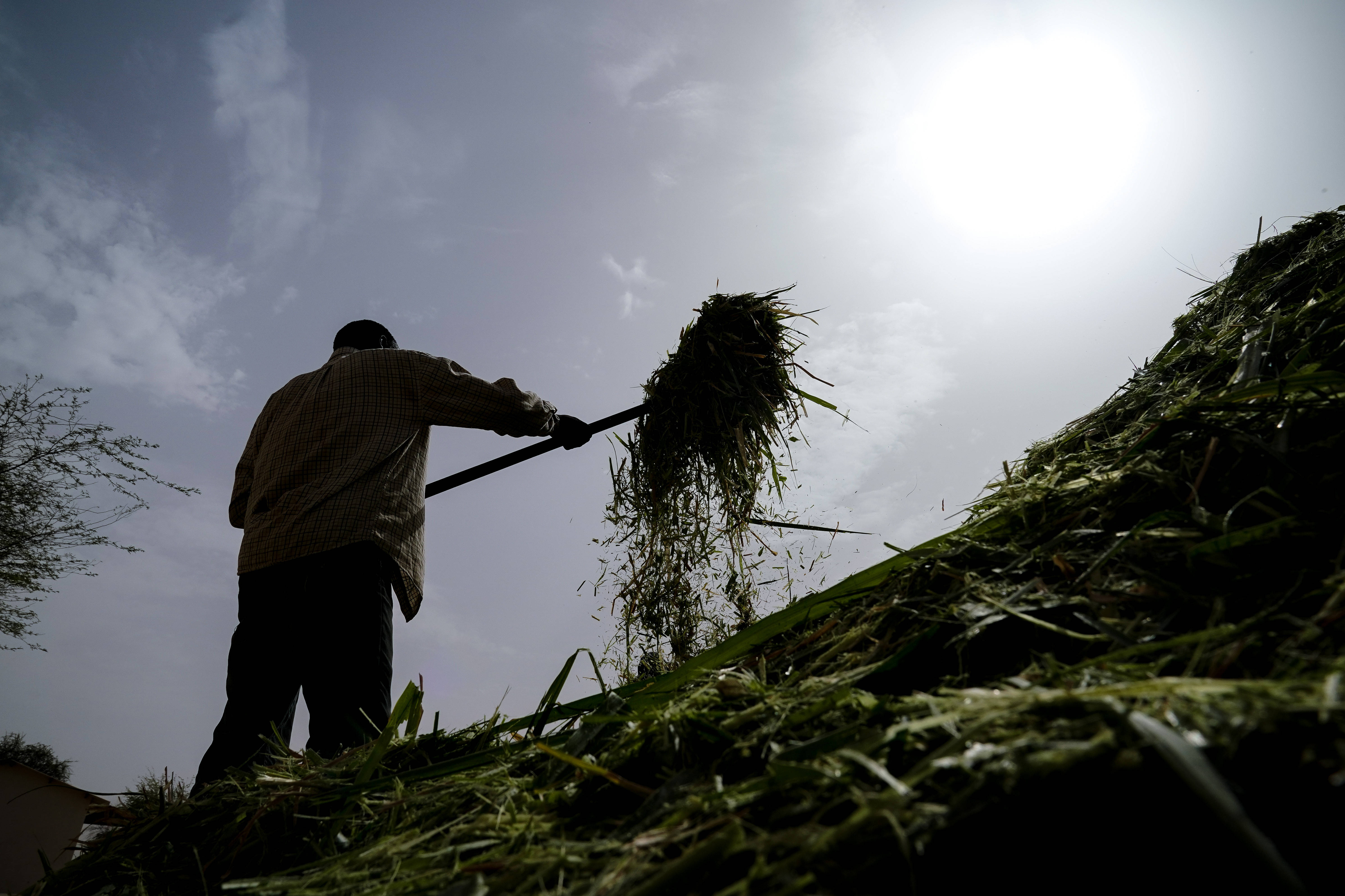 7月18日,在毛里塔尼亚伊迪尼村,牧民在中国援毛里塔尼亚畜牧业技术示范中心处理菌草。 新华社记者 韩旭 摄