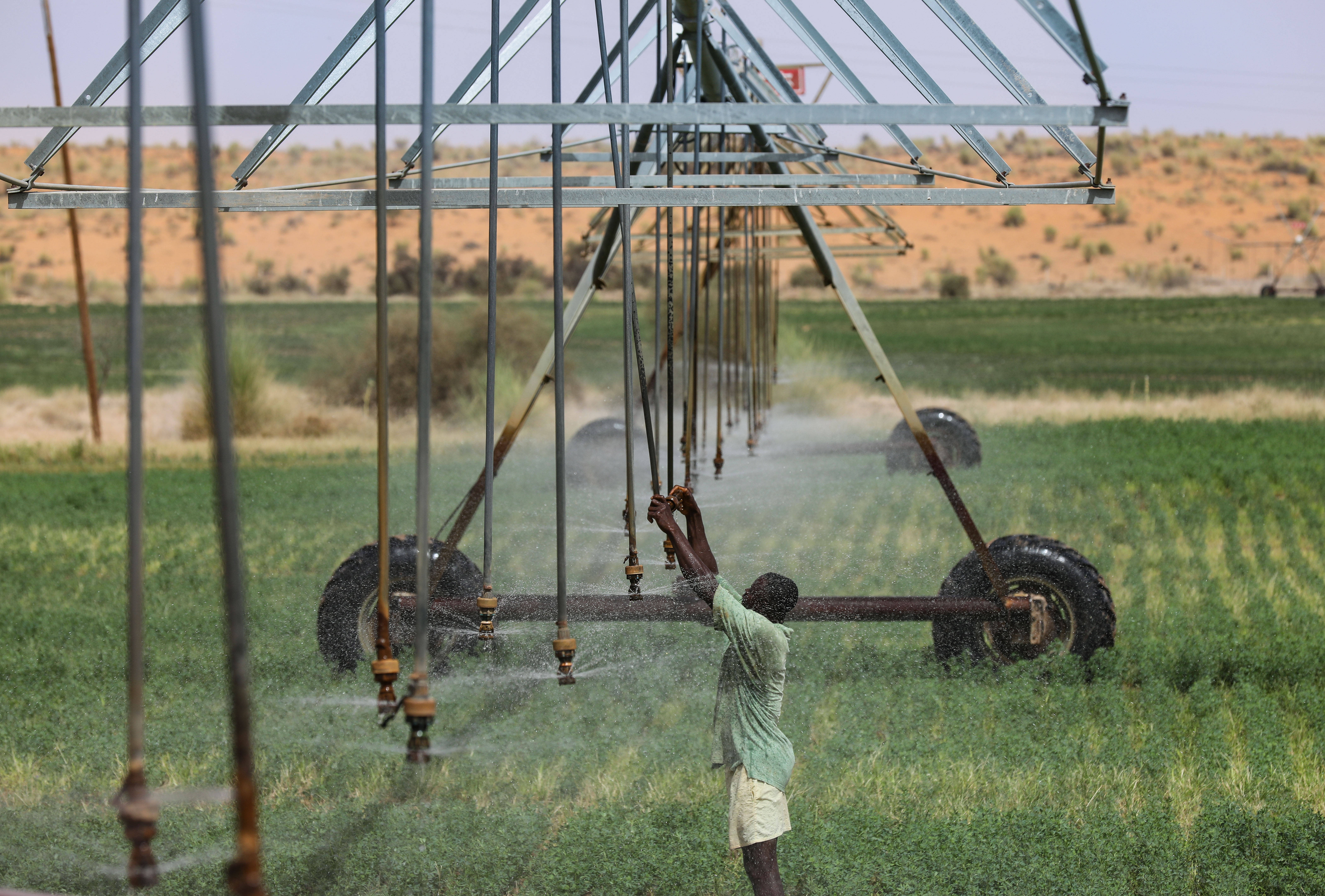 7月18日,在毛里塔尼亚伊迪尼村,牧民在中国援毛里塔尼亚畜牧业技术示范中心的紫花苜蓿田检查喷灌设备的运行情况。 新华社记者 韩旭 摄返回搜狐,查看更多
