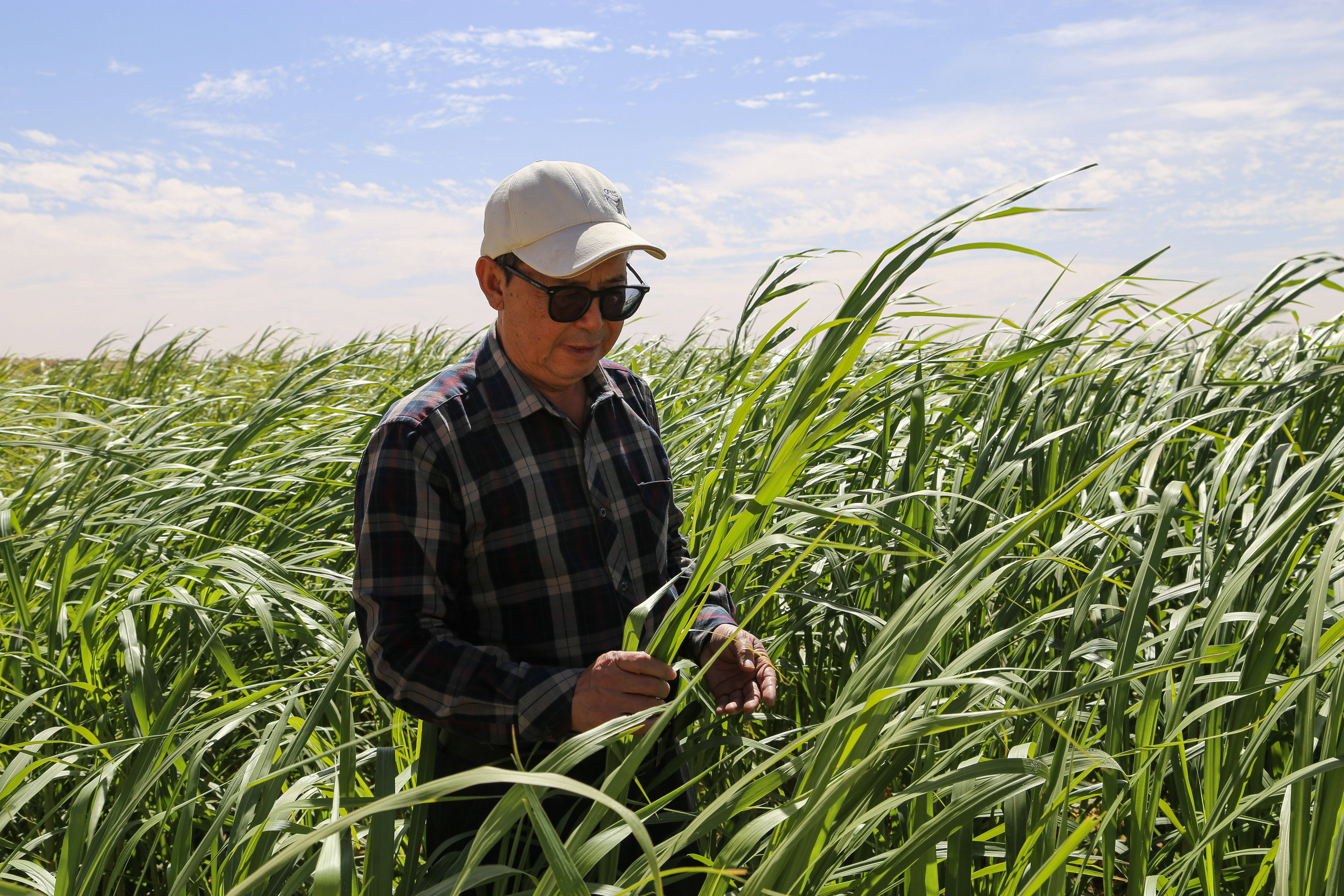 1月18日,在毛里塔尼亚伊迪尼村,中国援毛里塔尼亚畜牧业技术示范中心主任张洪恩在菌草田查看菌草生长情况。 新华社记者 司源 摄