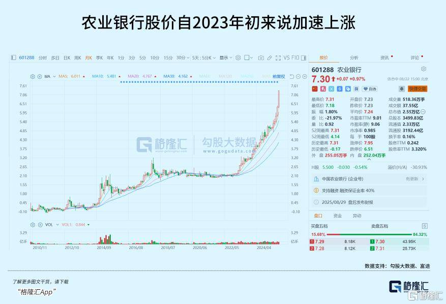同时,2025年至今,农业银行累计涨幅43.119%同样位居行业内榜首,成为年来新增市值规模最大的个股目前其总市值规模已高达2.55万亿元,超越建行成为仅次于“宇宙行”工商银行的第二大市值公司那么,为什么农业银行在近三年能呈现如此强势上涨?后续上涨空间又如何?。