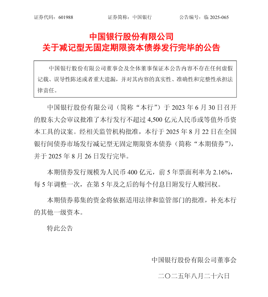 8月26日,中国银行发布公告称,已完成规模400亿元的减记型无固定期限资本债券(以下简称“永续债”)发行,前5年票面利率2.16%,每5年调整一次,在第5年及之后的每个付息日附发行人赎回权。