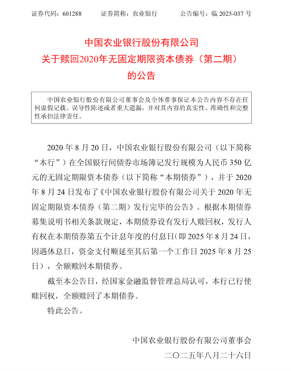 同日,农业银行披露,该行已全额赎回2020年8月20日在全国银行间债券市场簿记发行的规模350亿元永续债。