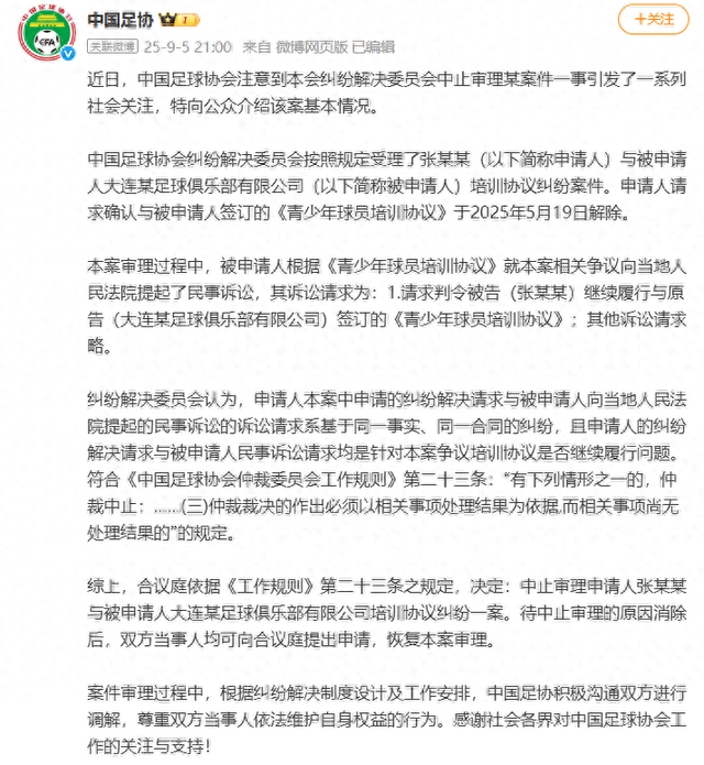 近日,中国足球协会注意到本会纠纷解决委员会中止审理某案件一事引发了一系列社会关注,特向公众介绍该案基本情况中国足球协会纠纷解决委员会按照规定受理了张某某(以下简称申请人)与被申请人大连某足球俱乐部有限公司(以下简称被申请人)培训协议纠纷案件。
